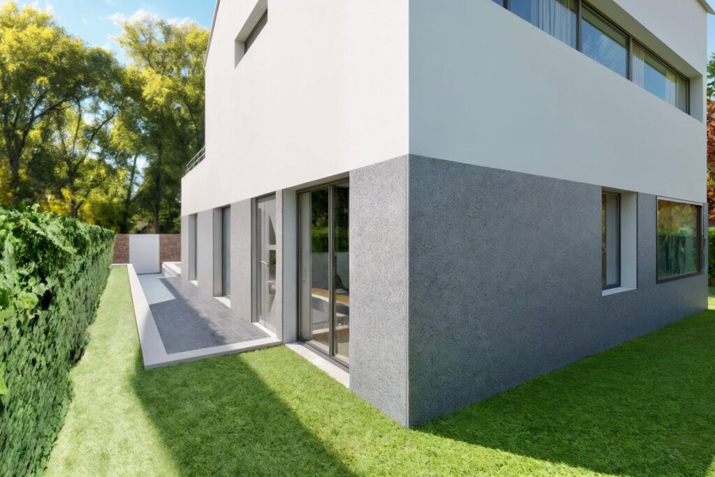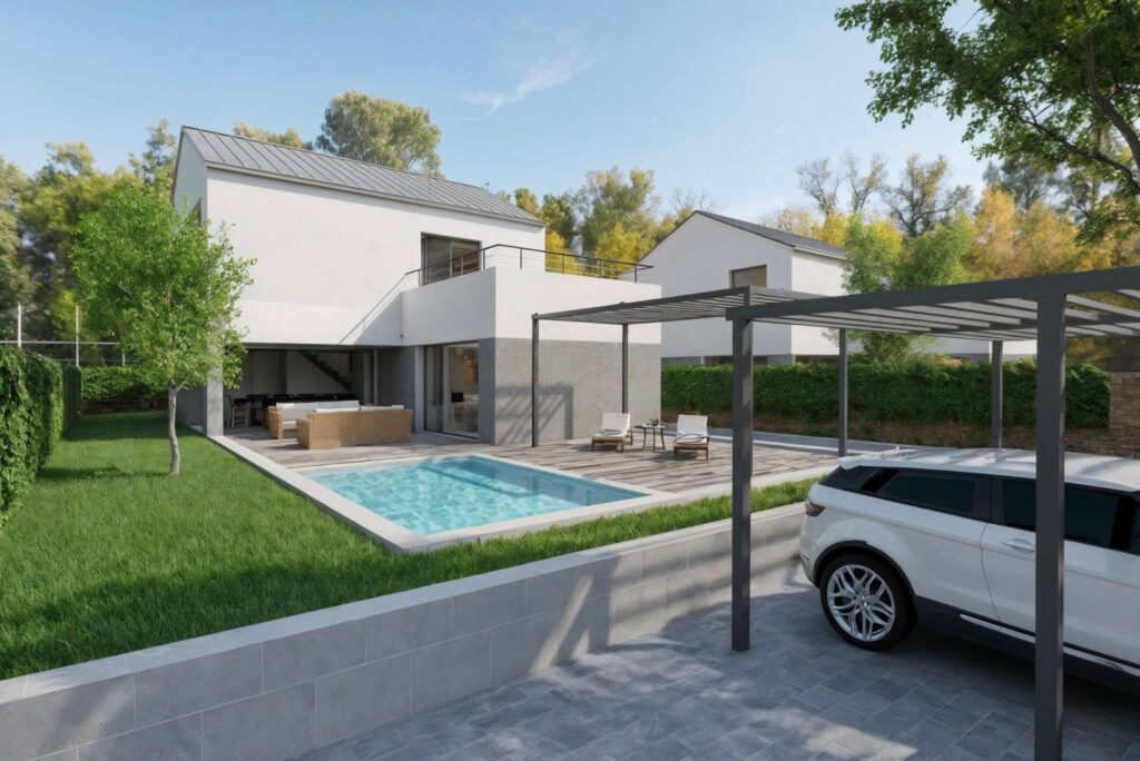 En el exterior de la casa encontramos: un aparcamiento con puerta de entrada motorizada con mando a distancia, un porche, un patio y una terraza. La zona de acceso creada a partir de peldaños y solados de solera de hormigone impreso, y un video portero automático.