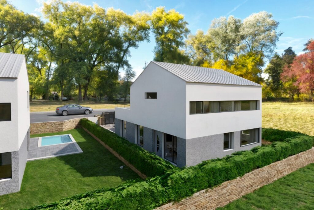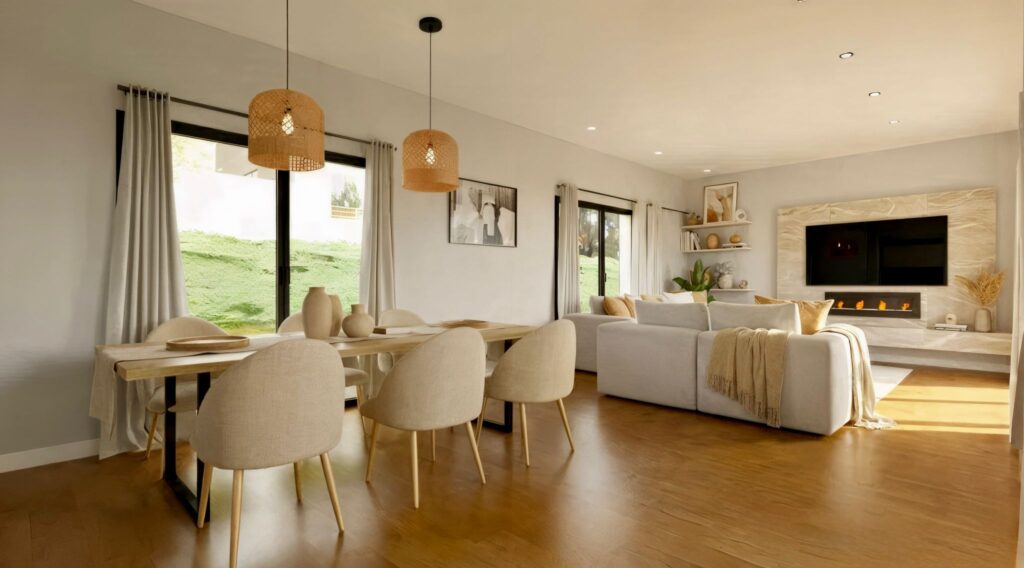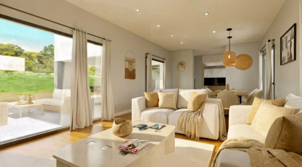 Se encuentra distribuida en dos plantas, la planta baja cuenta con una habitación de invitados con un baño propio, una cocina espaciosa y funcional ya amueblada, un aseo y un salón-comedor amplio con vistas al porche. La planta alta cuenta tres dormitorios: el principal con un baño y vestidor individual. También cuenta con un baño, y un estudio paralelo al dormitorio principal. Dispone de la posibilidad de crear una piscina privada con iluminación nocturna y depuración con sistema de cloración salina, para así reducir el de gasto del mantenimiento y mejorar la calidad de agua. Contiene un sistema individual de Aerotermia para la calefacción y el suelo refrescante.